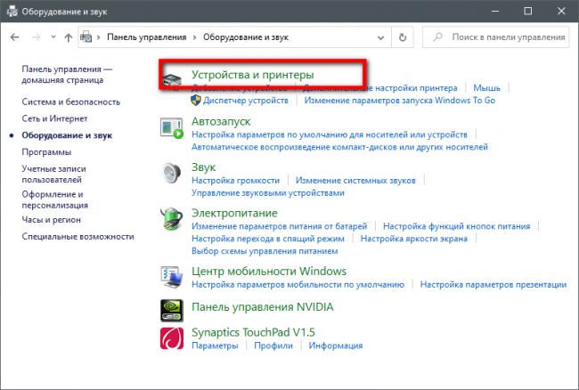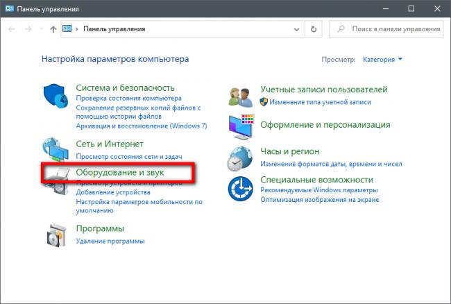 - «Оборудование и звук», далее – в список устройств (если выставлено «Категория»);