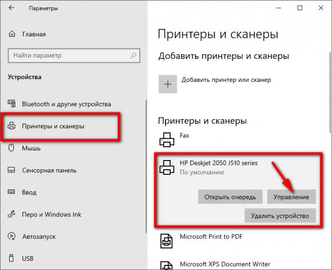 В окне параметров переходите по пунктам «Устройства», «Принтеры и сканеры». Справа выбираете нужный аппарат, кликаете на него и переходите в «Управление», где будет аналогичная функция.