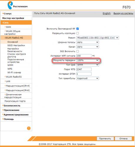 Как известно, мощность сигнала прямо пропорциональна расстоянию. Поэтому, чтобы получить максимальную зону действия Вай-Фай, необходимо выкрутить мощность передатчика на максимум. Делается это обычно в базовых параметрах сети (хотя иногда этот пункт прячут в расширенные опции).