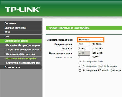 На роутерах Tp-Link открываем вкладку Wireless — Wireless Advanced. Пункт Transmit Power позволяет настроить силу сигнала. Значение High – означает максимальная мощность.