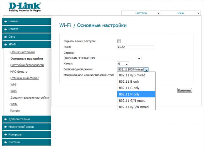 В настройках откройте вкладку, где настраивается беспроводная сеть. Называются они обычно так: Wi-Fi, Беспроводной режим, Беспроводная сеть, Wireless и т. д. Найдите там пункт Режим беспроводной сети (Mode) и установите в нем N only. То есть, работа сети только в режиме N.