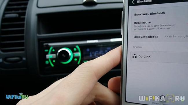 После подключения, следует сделать первичное сопряжение по блютуз с любым гаджетом. Активируйте опцию Bluetooth на смартфоне, обнаружьте автомобильную точку доступа и подключитесь к ней. При первичном подключении понадобится ввести пароль. Стандартным является «0000», но точно можно узнать из инструкции к адаптеру.