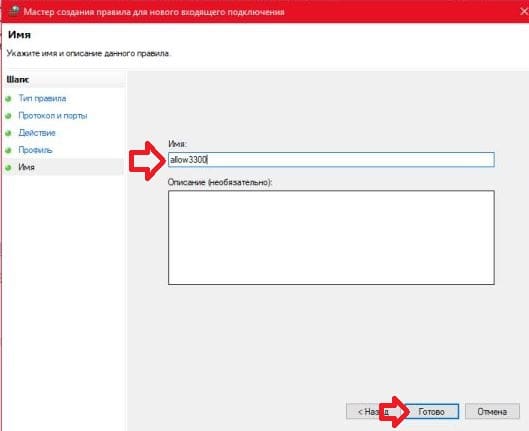 8. Придумайте и напишите имя для созданного вами правила, чтобы в будущем легче было его найти, также вы можете добавить описание, что не является обязательным. По завершению нажмите “Готово” и можете закрывать брандмауэр, правило создано и уже работает.