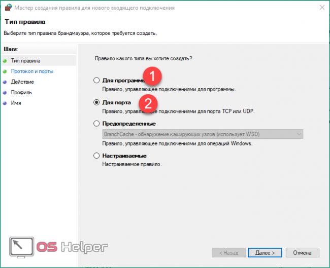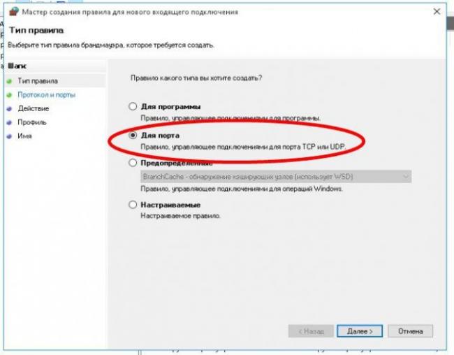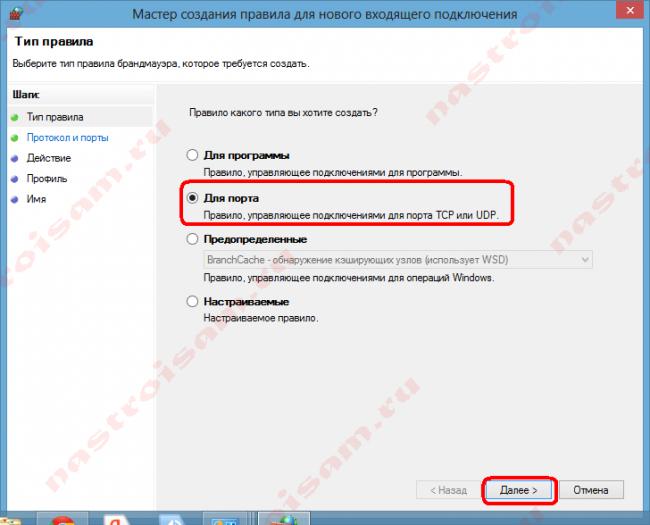 4. Поставьте точку возле “Для порта” и нажмите “Далее”.