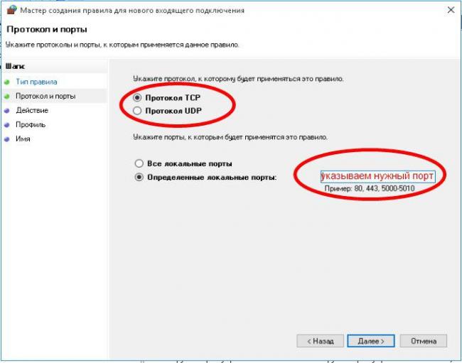 5. Возле “Определенные локальные порты” введите порт, который вы хотите открыть и нажмите “Далее”.