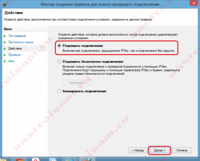 6. Поставьте точку возле “Разрешить подключение” и нажмите “Далее”. Если вы хотите больше настроек для данного порта, выбрать кому дать доступ и т.д. – поставьте точку возле “Разрешить безопасное подключение”.