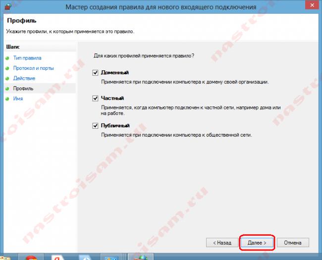 7. Выберите для каких профилей сети применять правило и нажмите “Далее”.